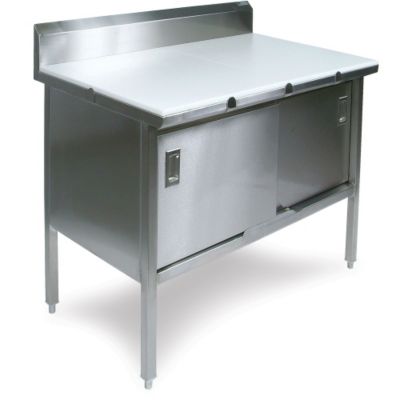 Type 300 stainless steel. 16-gauge stainless steel base and doors. 3/4" thick high density polyethylene top. Completely sanitary. Poly top is sectioned per NSF regulation. Four 1 1/2" square edge legs with adjustable bullet feet. Under shelf is 14 7/8" above the floor. Sliding doors with recessed handle slide on nylon roller bearing glides. NSF listed. All-welded. Read More..