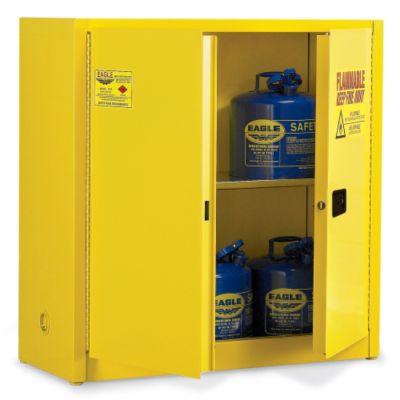 EAGLE Double-Wall Flammable Liquids Safety Cabinet is rated for type I and II containers up to 5 gallons in size. Feature double-wall, 18-gauge welded steel construction with 1 1/2" air space that prevents build-up of explosive gases. In the event of a fire, units with self-closing doors close automatically at 160F via a melting link to prevent flames from reaching contents (meets Uniform Fire Code, UFC). Dual 2" capped vents provide external exhaust. Ground wire connection prevents static buildup (wire not included). Flush-mount handle includes 3-point lock to secure contents. Shelves are adjustable to accept different sized containers. Leakproof 2" base sill keeps hazardous liquids inside cabinet. Labeled with large easy-to-read "Flammable Keep Fire Away"message in three languages. NOTE: Eagle quality cabinets comply with OSHA standard 1910.106, are designed to meet NFPA Standards 29 and 30, and most have been tested by Factory Mutual Research and/or Underwriters Laboratories. Please note: California and portions of other localities may require self-closing safety cabinet doors. Please check your local codes before ordering. Read More..