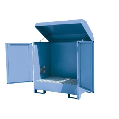 EUROKRAFT Steel Outdoor Drum Storage Cabinets have lockable hinged lid and doors for secure storage. Lid lifts open for access to top of drums and is supported by heavy-duty gas cylinders. Removable spark-resistant galvanized steel grating. Four-way fork entry. Also features passive ventilation and leakproof sump welds. Welded steel construction. Coated with a durable, corrosion- and weather-resistant finish. Meet EPA and UFC requirements. Read More..